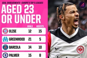 ■欧洲五大联赛23岁及以下球员进球+助攻总榜: